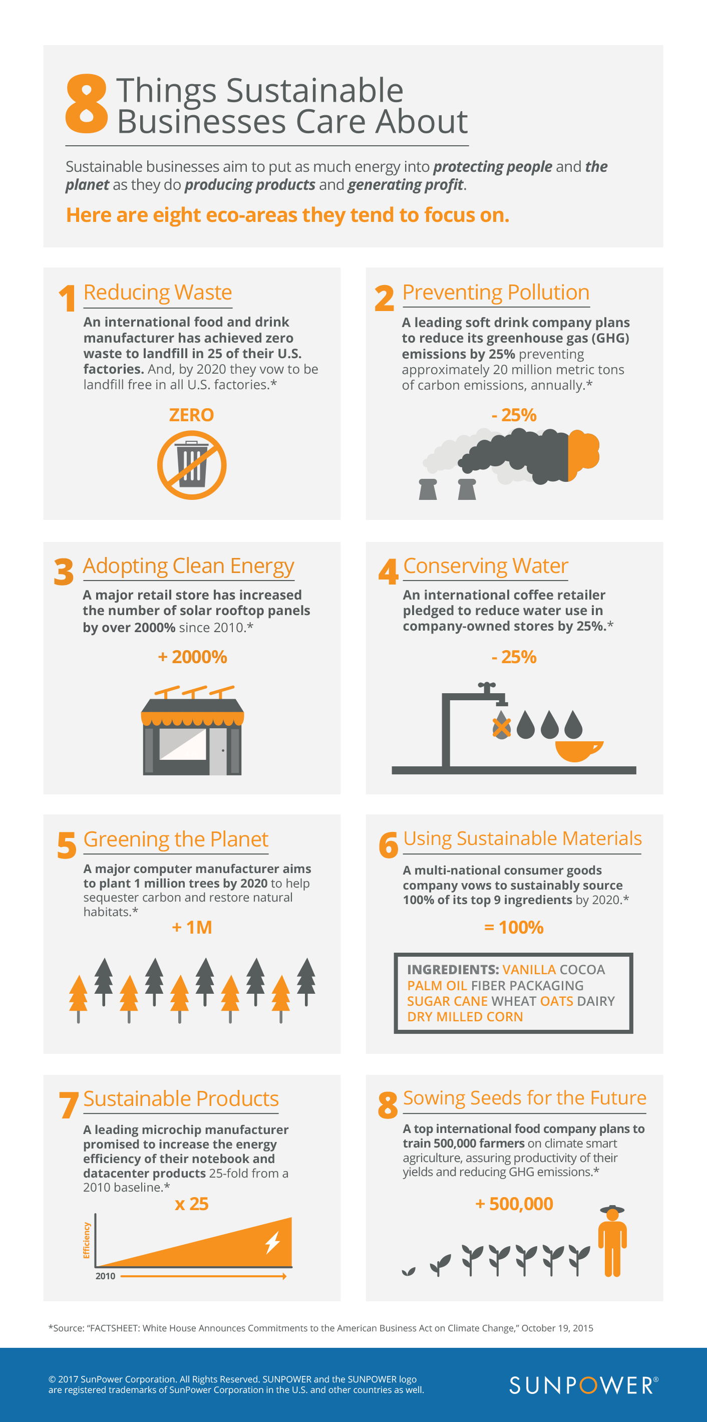 If you’ve wondered, “What is sustainability?” when it comes to business, this infographic can help. It shows eight of the most common things companies focus on when they implement sustainable business practices.